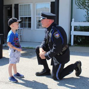 Lee’s Summit Police Department Officer Nathan Cantrell has a conversation with Macklin Miller during Peculiar’s Tailgate Festival, which honors area first responders. (Tyson Fisher/Raymore Journal)